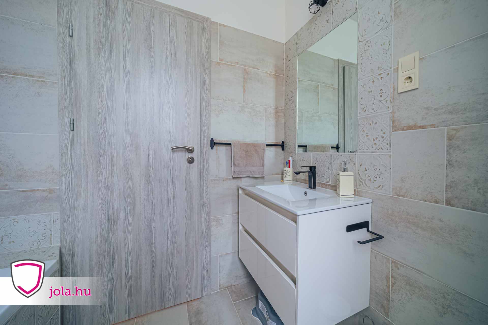 A hőszigetelésen, árnyékolástechnikán és homlokzati nyílászárón kívül az Erkado legnépszerűbb tele ajtaját, az Altamurán választották szürke fenyő színben, padlónak pedig a Krono Twilight Sterling Oak típusát, fózoltan.