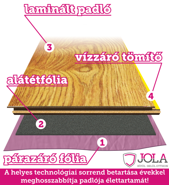 Azonban a laminált padlót nem csak felülről, alulról is védeni kell. A simított betonra célszerű 80 mikron vastag létrázható fóliát tenni. A fóliákból a teríthető és a járható illetve a létrázható a beszerezhető, nekünk a legvastagabbra a létrázhatóra van szükség. Ez álltalában 4x5m2 méretben kapható. Illesztés esetén legalább 20cm átfedéssel kell illeszteni, majd ragasztószalaggal rögzíteni. A falnál érdemes kb.:10cm magasságban felengedni, majd a szegélylécezés előtt sniccerrel körbevágni.
